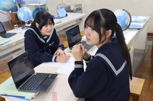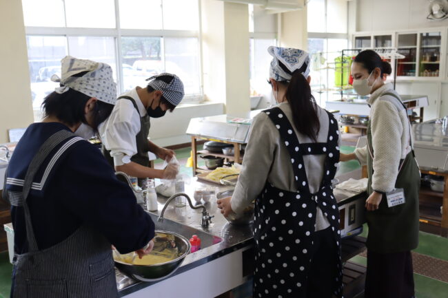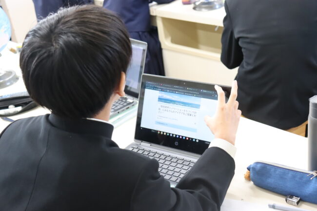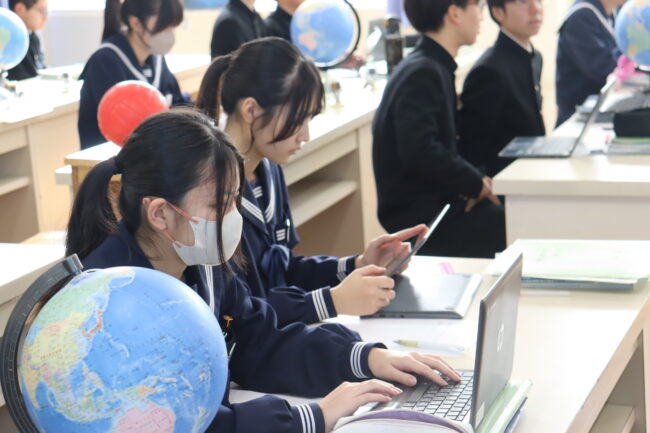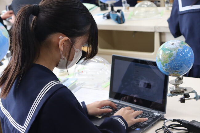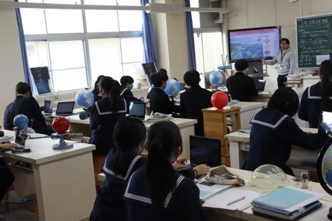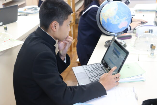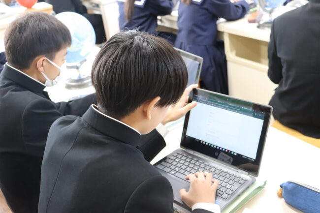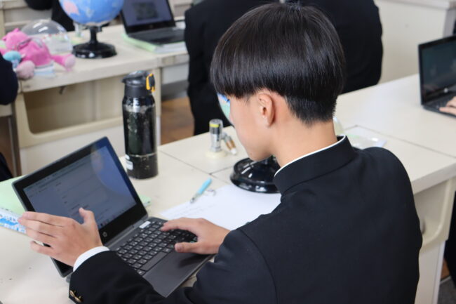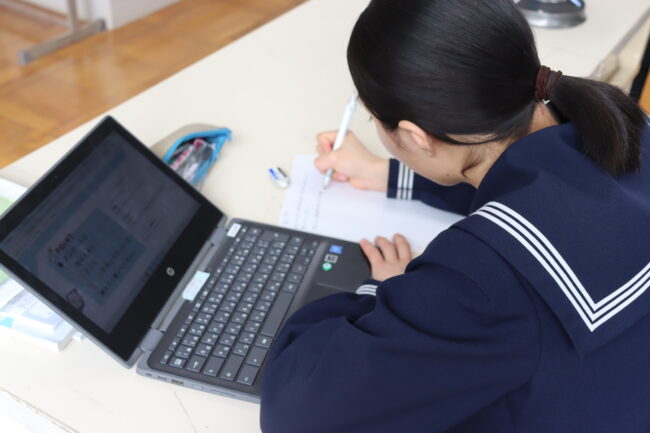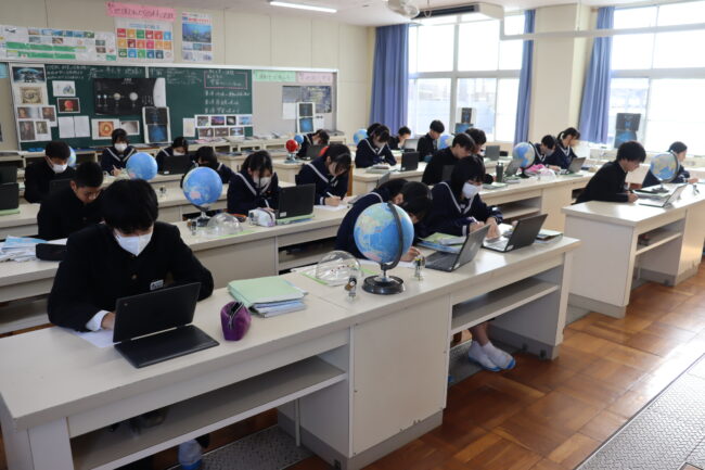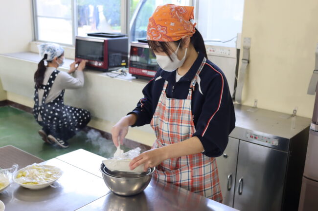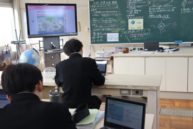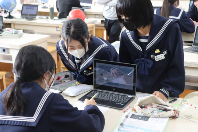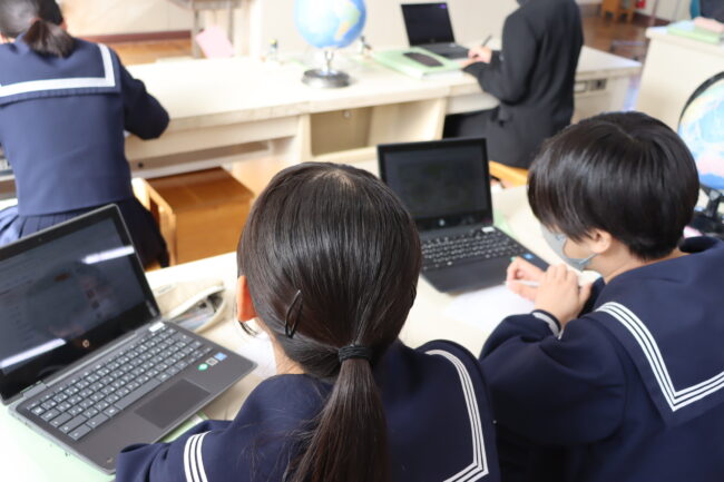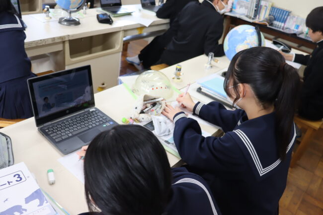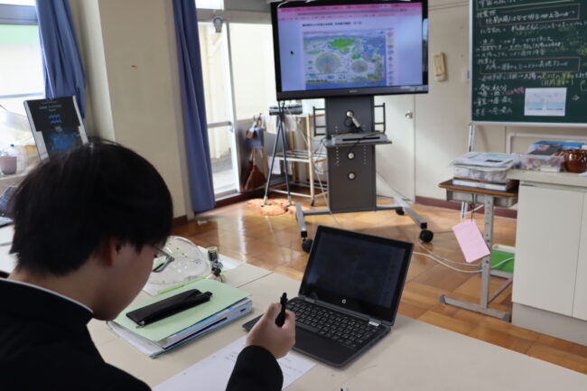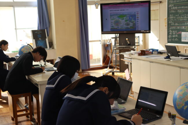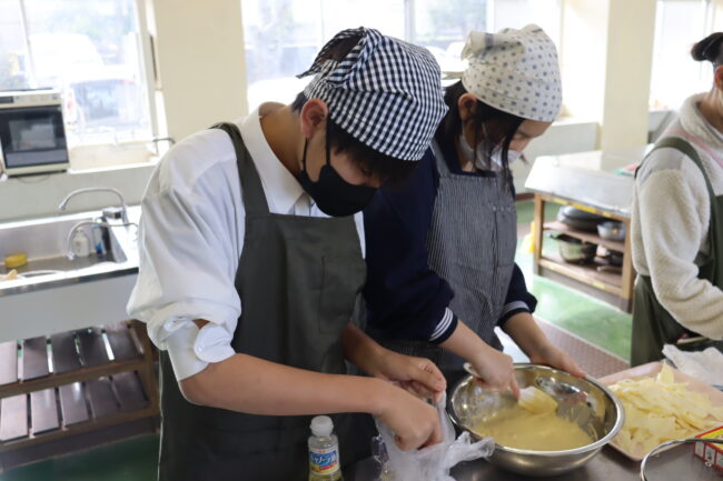 理科の授業で御前崎市リノベーションまちづくり計画のアンケートに協力して回答をしました。7組では栽培、収穫したさつまいもを使って調理実習を行いました。