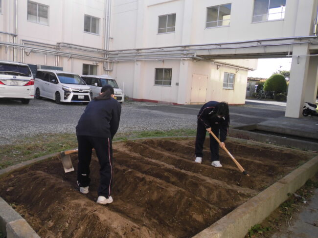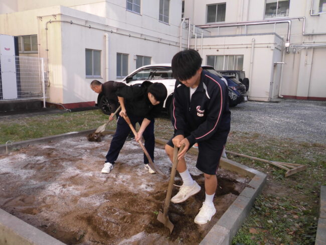 技術の授業で農園の整備を行い、次の栽培に向けて整備をしました。