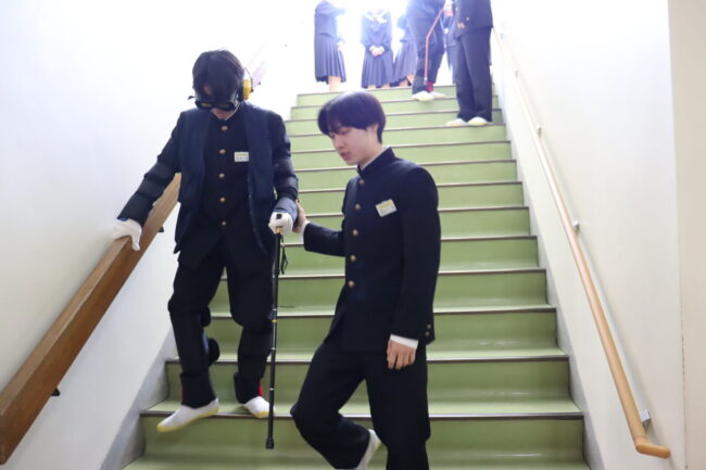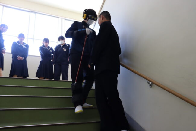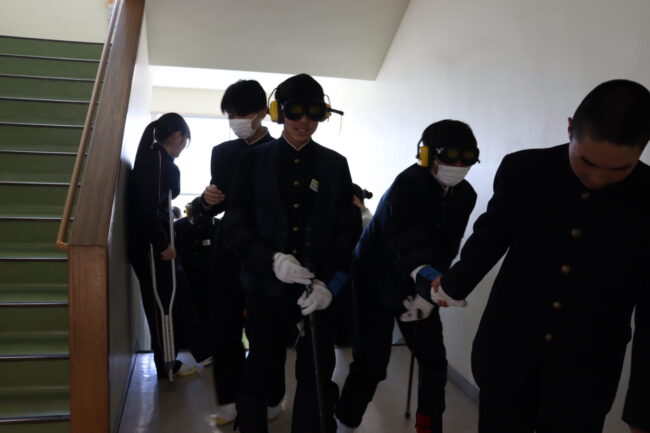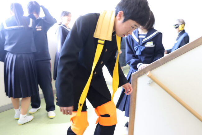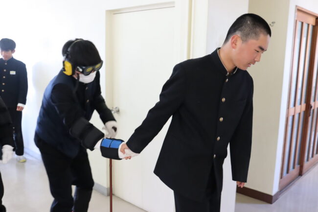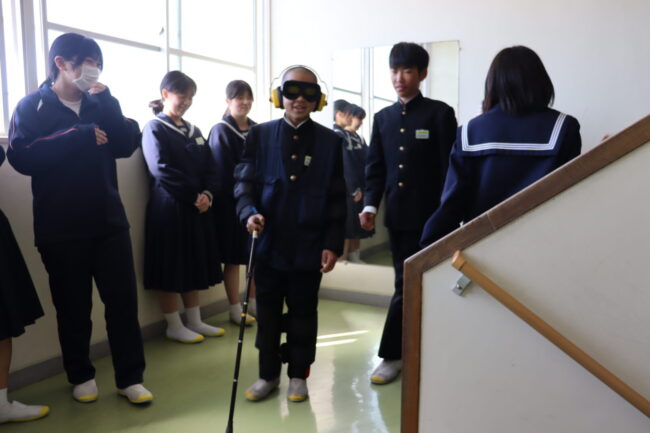 3/10(火)家庭科の授業で、耳にヘッドフォンをして聞こえにくくしたり、目にはゴーグルをかけ視野を狭くしたりしました。関節には器具を付けて曲がりにくくなっています。高齢者の日常の生活の大変さを身をもって体験しました。