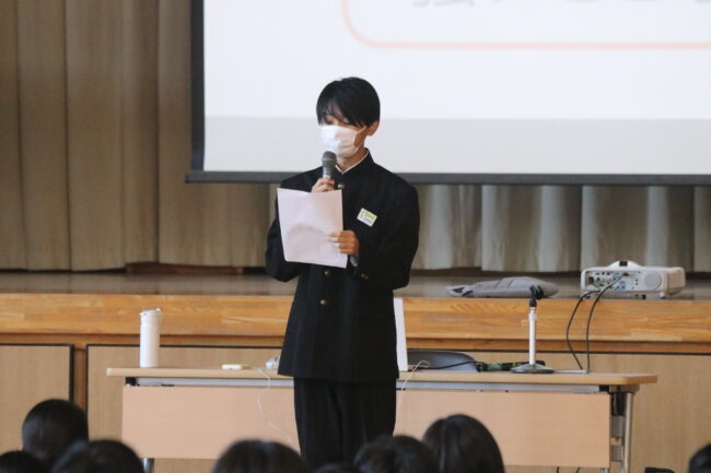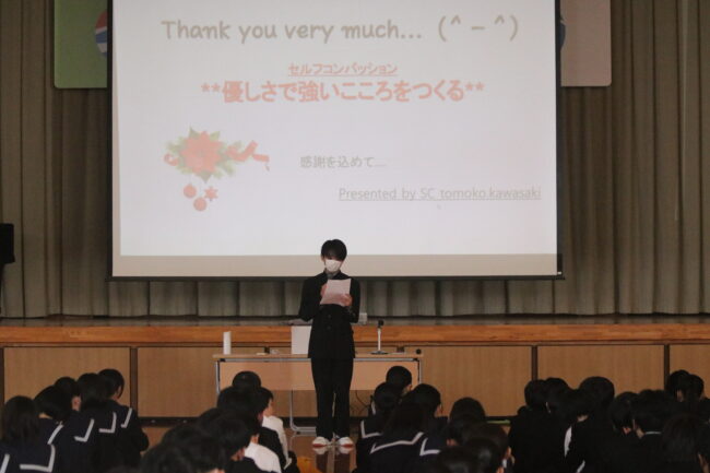 学校保健委員会 2025/12/02 12/2(火)スクールカウンセラーによる「セルフコンパッション」のお話を聞き、自分に置き換えてトレーニングしました。人間は誰しも自己嫌悪に陥ったり、自分を責めたりすることがあります。そんな時、ありのままの自分を受け入れ、自分を大切にすることが自分とうまく向き合うコツの一つです。そして、それは他者を大切にすることにもつながる気がします。ぜひ心がけてみましょう。