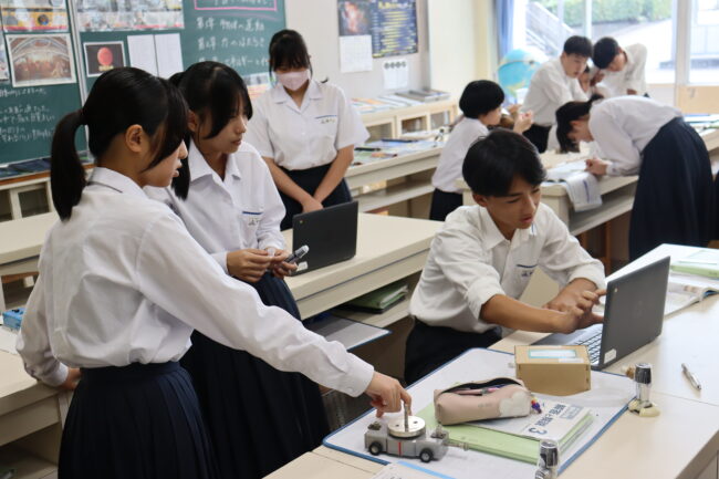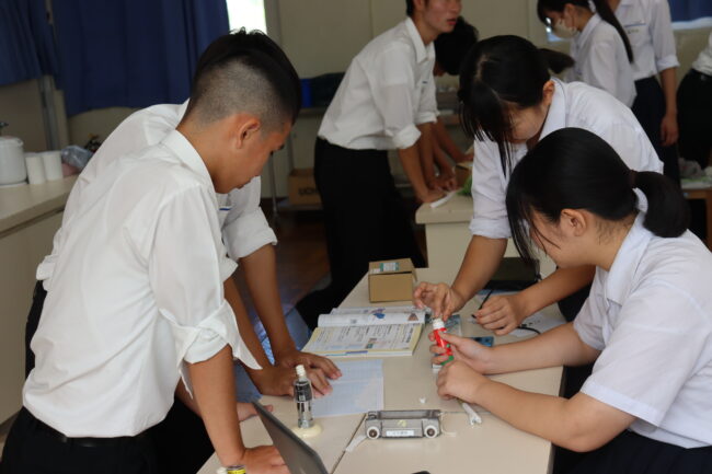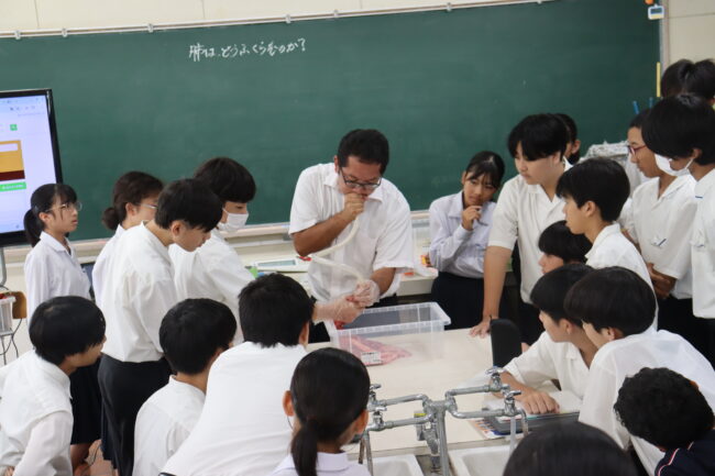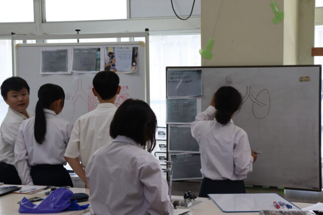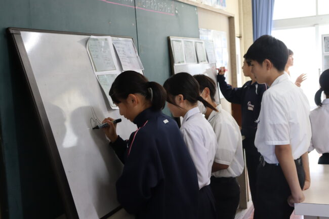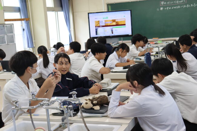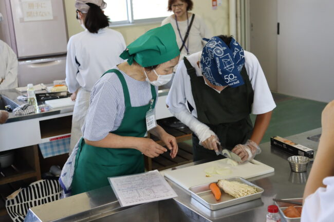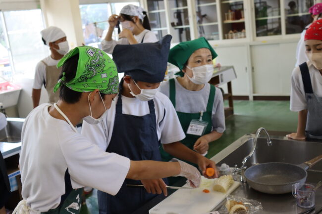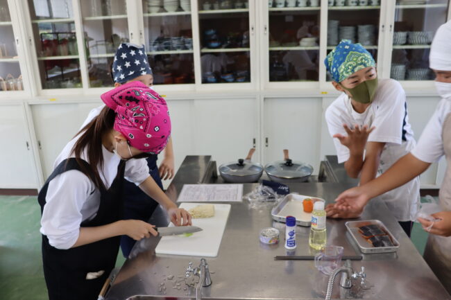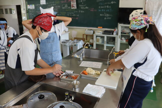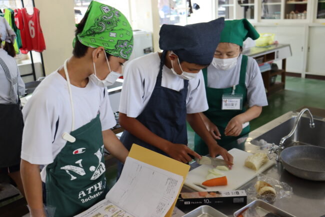 9/16(火)1年生の家庭科で調理実習を行っています。地域の2名の方が授業の支援として協力していただきました。生徒は楽しそうに鮭のムニエルの調理をしていました。ありがとうございました。